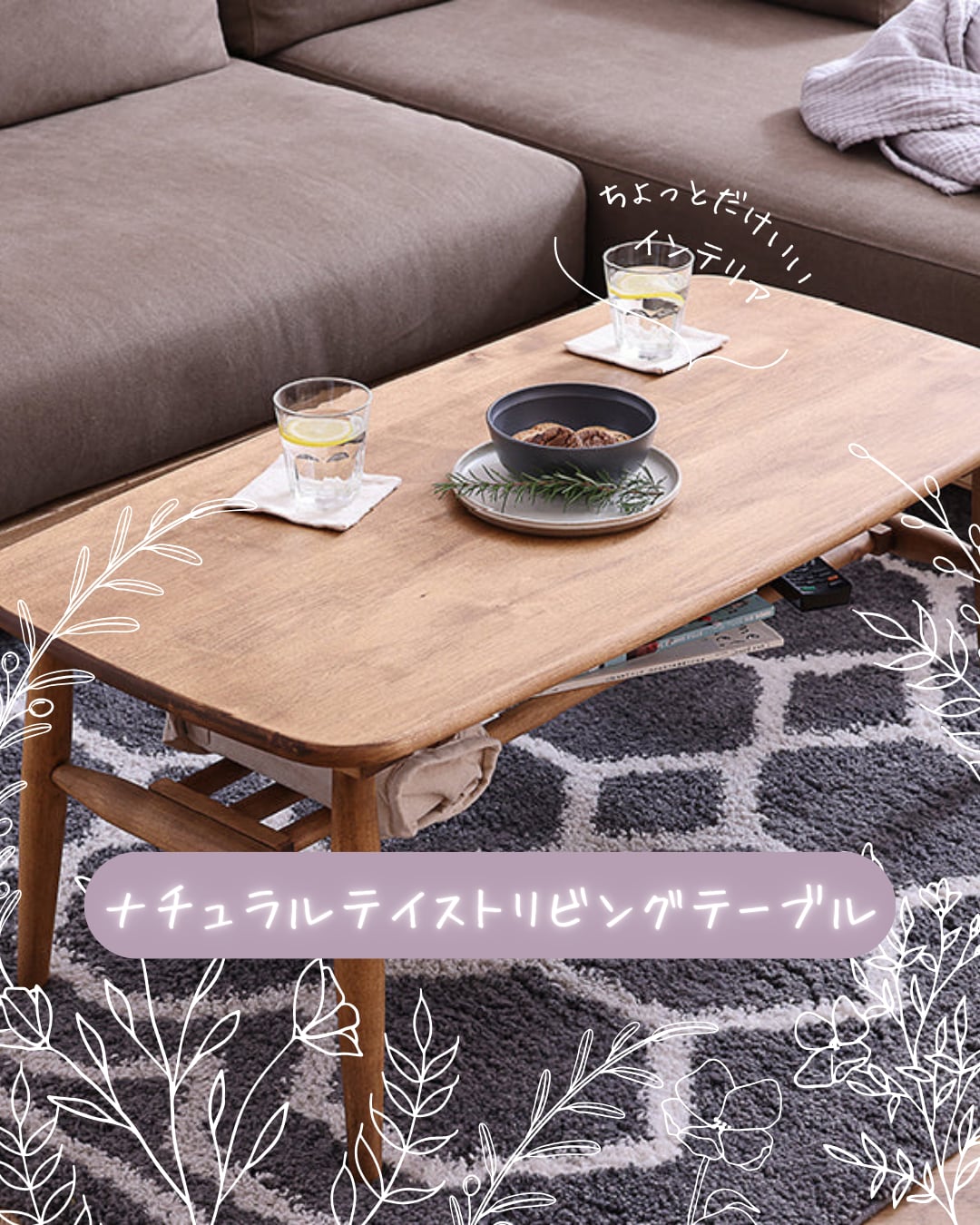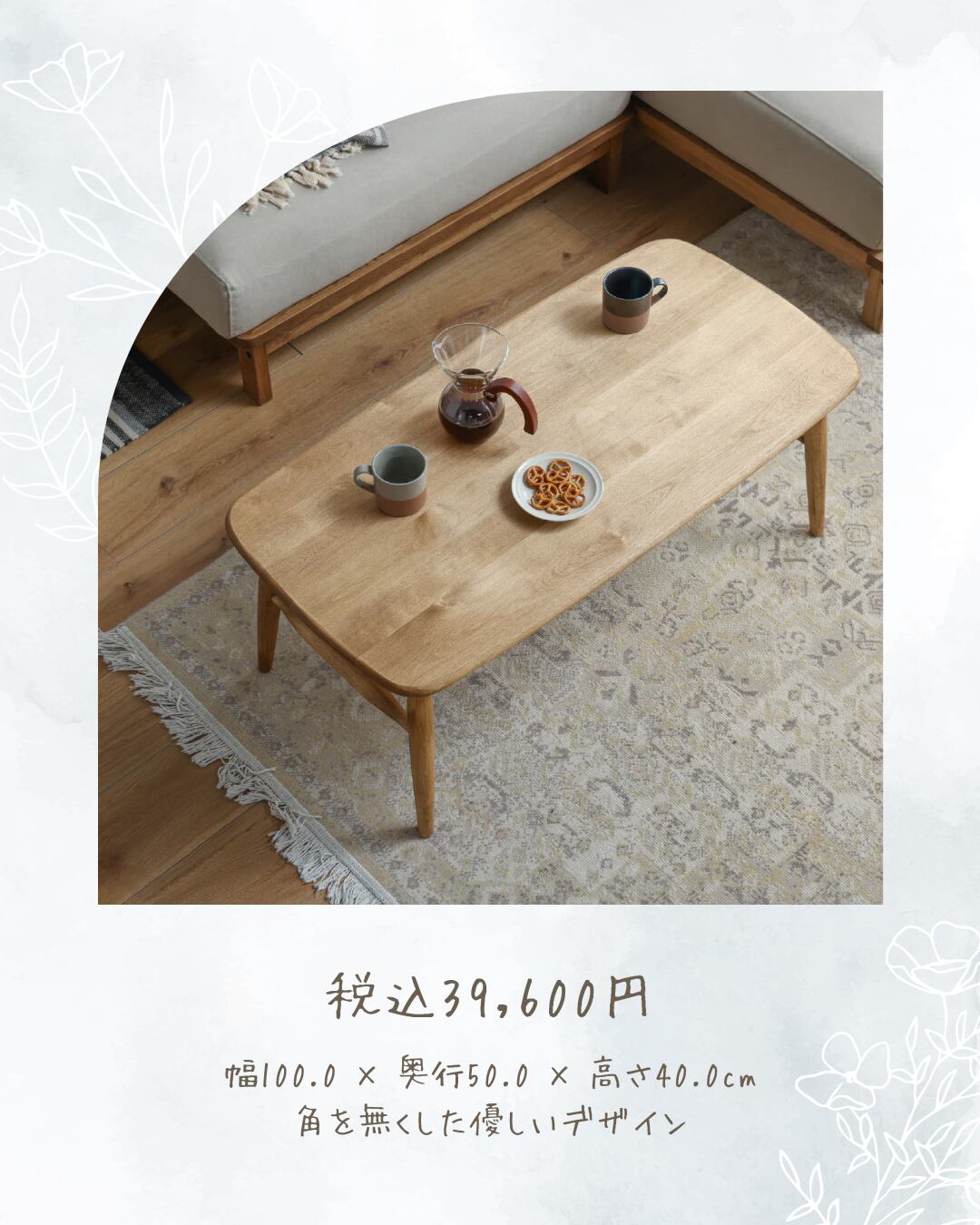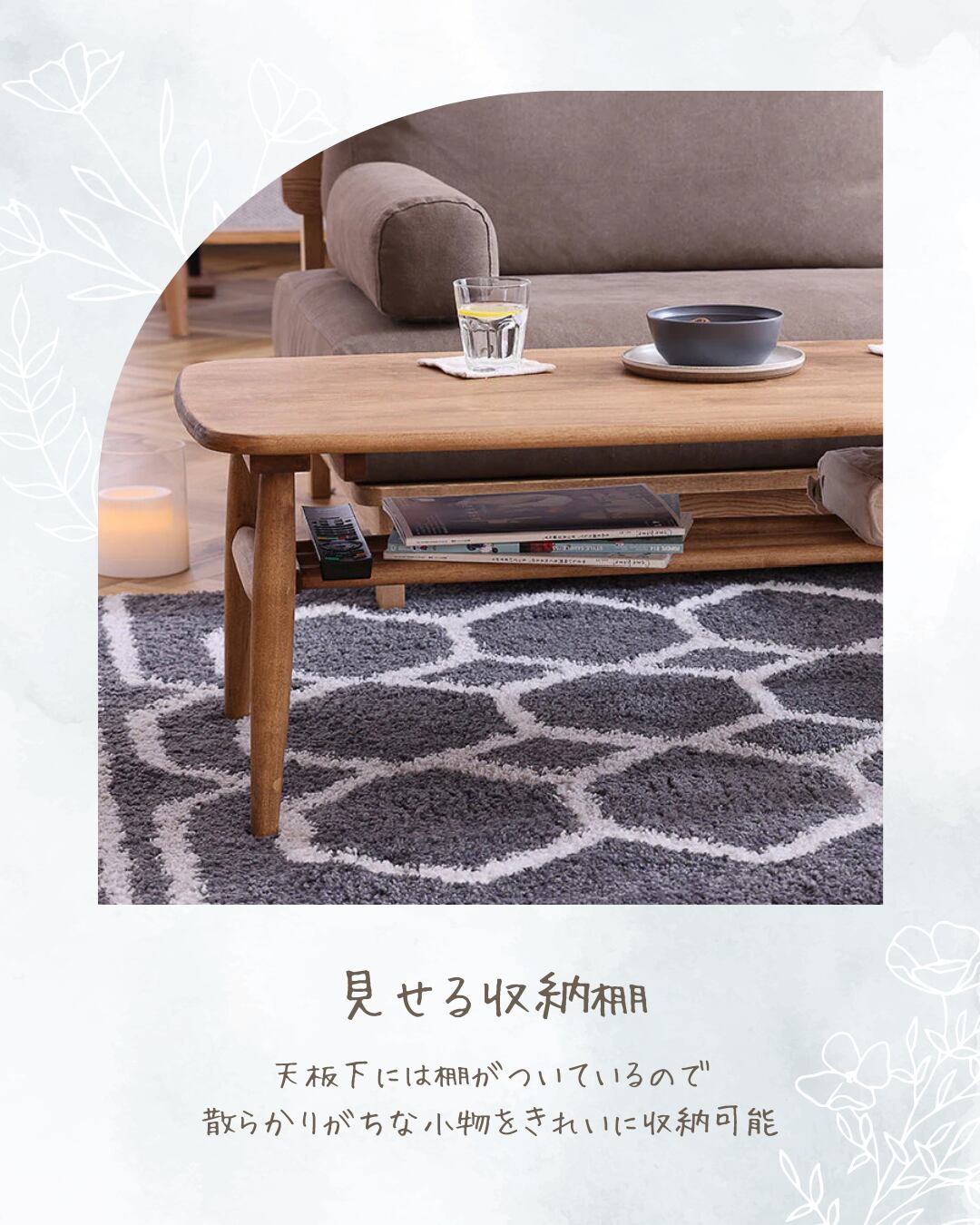 商品情報 バーチ材天然木を使用したナチュラルテイストなセンターテーブルです。角のない優しい丸みを帯びた天板の形状です。天板下には棚が付いているので、テーブルに出ているものをさっと仕舞うのにとても便利です。